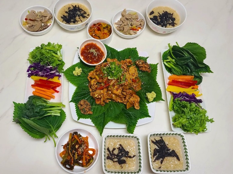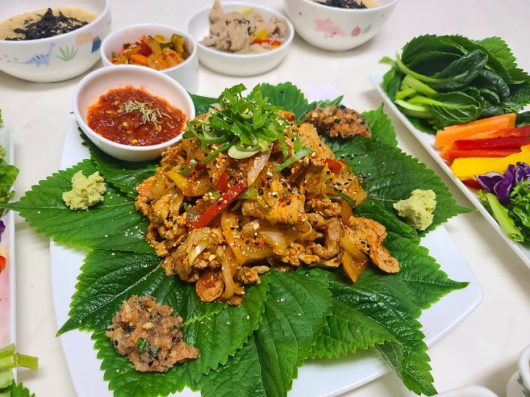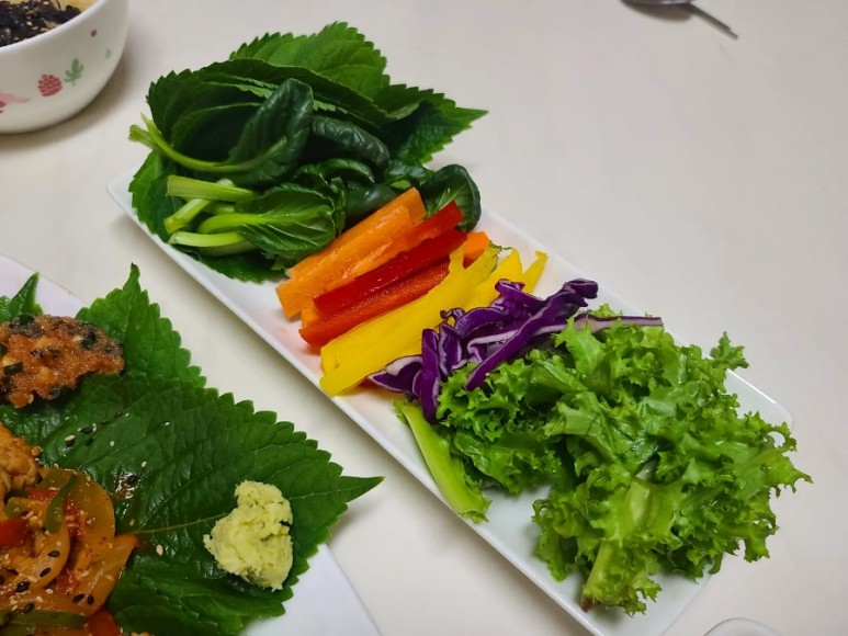 깻잎 위에 생야채를 올리고 고기와 고추냉이를 얹어 먹었더니 정말 건강했어요.
