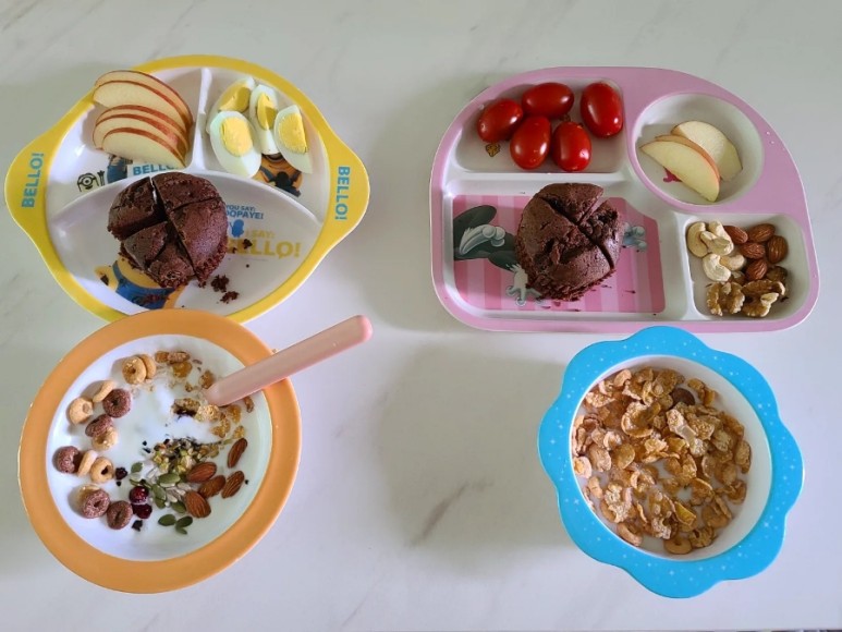 요구르트를 좋아하는 파밤은 견과류와 시리얼(소)을 넣습니다.갓 싫어하는 룰루는 시리얼에 우유를 넣고
