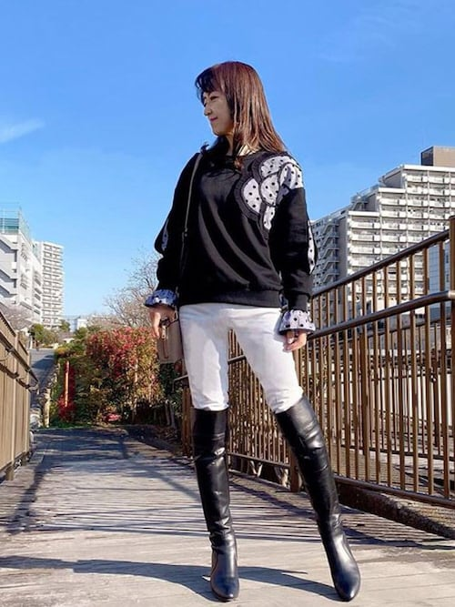 꽃무늬 티셔츠에 흰색 바지, 그리고 니하이 부츠를 신었습니다.