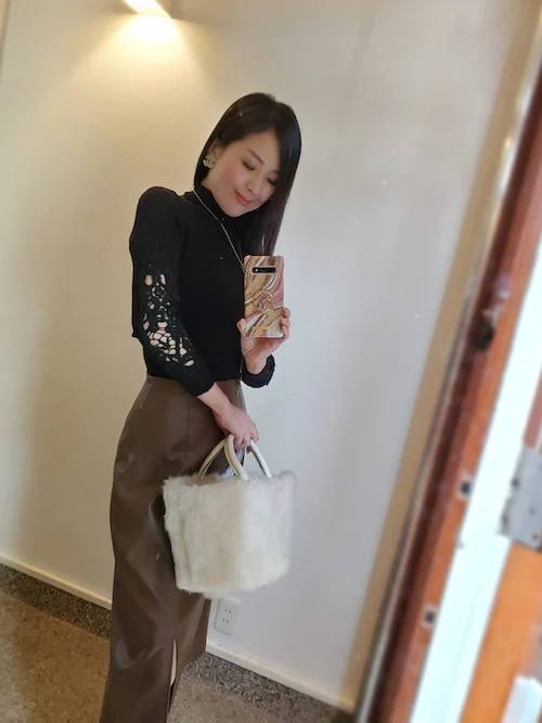 팔에 레이스가 살짝 들어간 검은 반폴라니트에 갈색 가죽바지 선택! 귀걸이는 샤넬이네요.