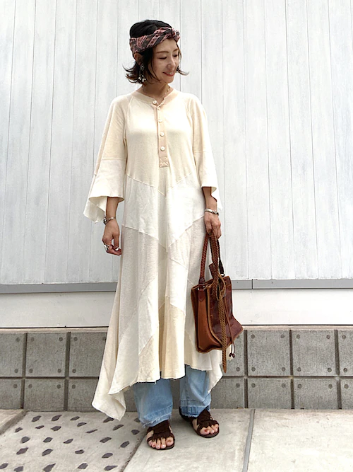 원피스 디자인이 독특하지만 청바지와 샌들 조합으로 캐주얼한 느낌이 물씬 풍깁니다.