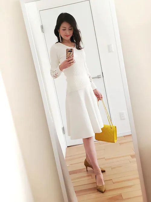 흰 브이넥 니트와 흰 스커트로 밝은 분위기를 자아내고 있습니다.