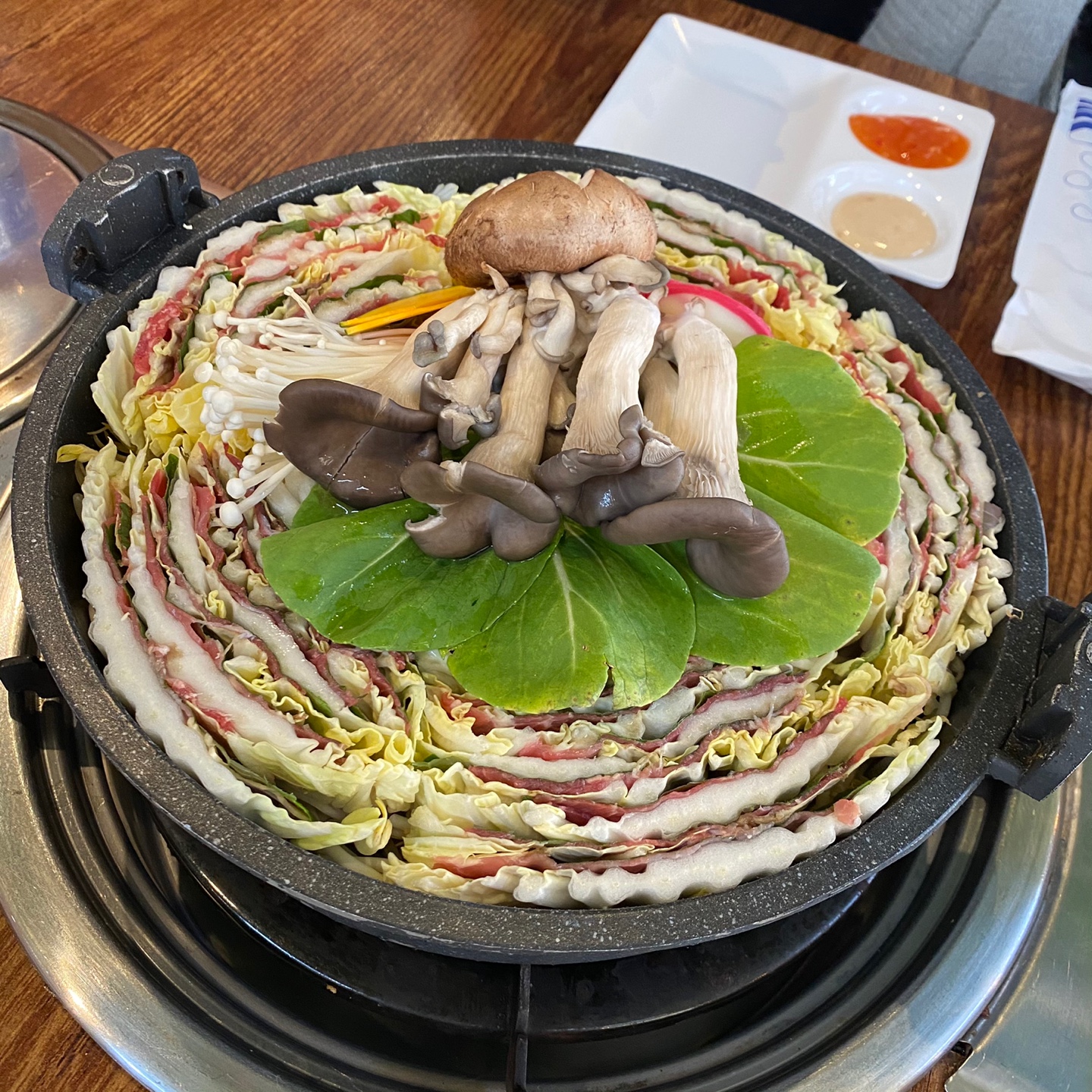 우리가 주문한 1번 코스 요리인 밀푀유 냄비+바지락 칼국수가 나왔다. 이 비주얼 모델 아니죠? 배추와 고기를 포개어 다양한 야채로 토핑한 일산 홍대 수엔샤의 대표 메뉴! 먼저 밀푀유 전골을 먹은 후 칼국수를 넣어 먹고 죽을 끓여 먹는 코스 메뉴이다.
