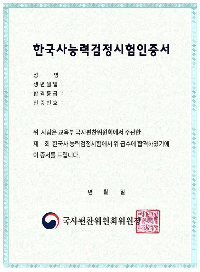 2022 한능검 응시요강_한국사능력검정시험인증서[견본] 한능검은 응시자 본인이 직접 홈페이지에 접속하여 성적조회를 하여야 하며, 한국사자격증을 발급하여 출력할 수 있습니다.한국사능력검정시험증명서, 한능검 성적통지표 등은 별도로 발급되지 않습니다.