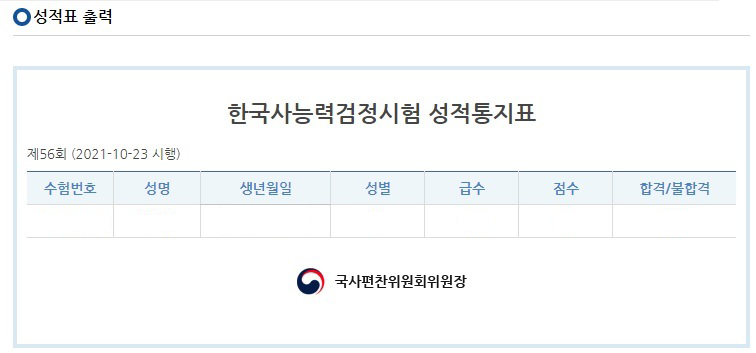 성적 통지표에는 합격 여부와 본인의 점수, 급수까지 상세하게 기재되어 있습니다.