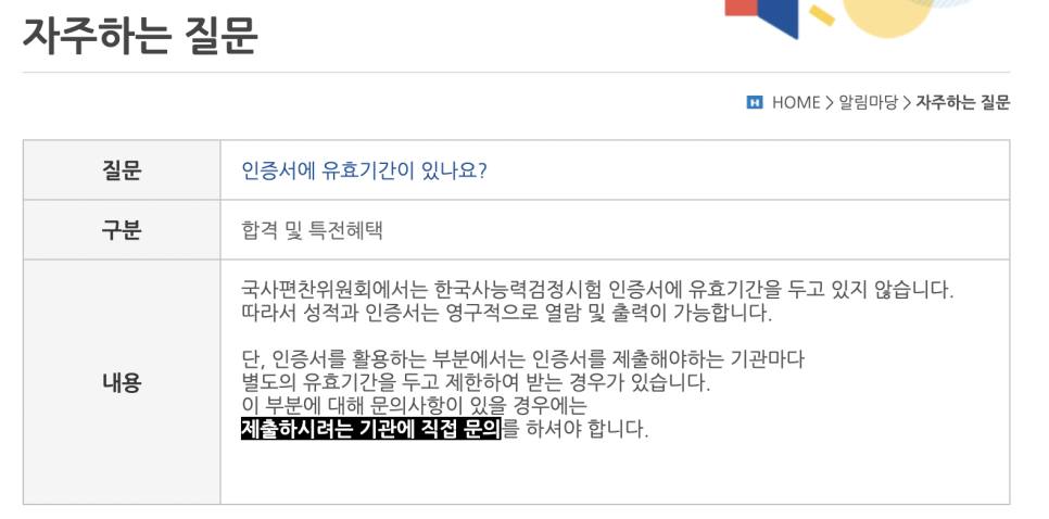 한능검 홈페이지의 여러분이 궁금해했던 한국사 자격 유효기간에 대한 내용은 한능검 홈페이지에서 자주 묻는 질문에서도 확인할 수 있습니다.