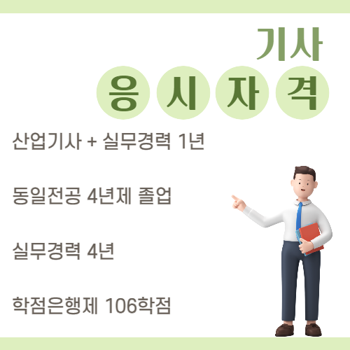 1. 산업기사 + 실무경력 1년 2. 동일전공 4년제 졸업 3. 실무경력 4년 4. 학/점/은행/제106학점 취득