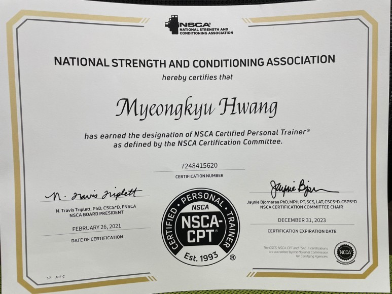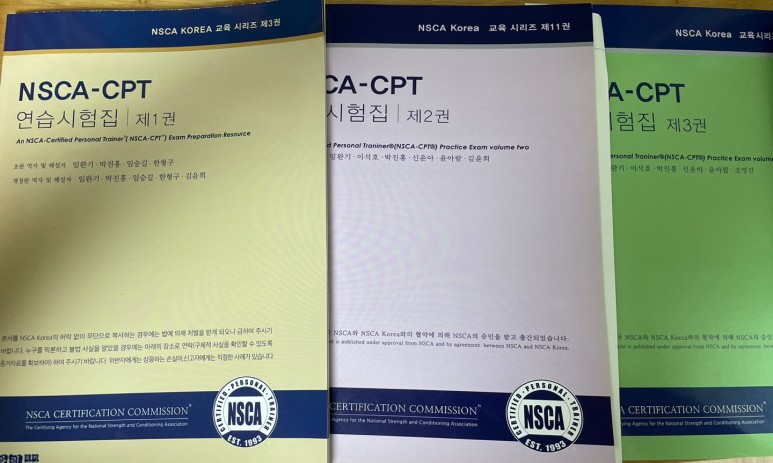 지난 2021년 2월 26일 대구에 있는 영진전문대까지 가서 NSCA-CPT 자격증을 취득했습니다.먼저 NSCA란?-National Strength and Conditioning Association의 약자로 ‘미국 체력관리학회’입니다.- 세계에서 가장 먼저 CPT 자격을 시행한 단체로 국제적으로 권위 있는 단체입니다. – NSC는 비영리 법인으로 현재는 세계 80여 개국에 약 60,000명의 회원이 소속되어 있으며 20여 개국에서 8개 언어로 시험을 치르고 있습니다.- 현재 NSC 자매단체는 한국을 비롯해 일본, 스페인, 이탈리아, 중국이며 독일, 인도, 싱가포르, 요르단이 합류할 예정입니다.그리고 NCCA라는 National Commission For Certification Agencies에서 인정하는 공인 자격증입니다!이 기관에서 인정하는 자격단체에는 NSC를 제외하고 ACSM이나 NASM 등이 있습니다.저는 이 중에서 트레이너로서의 기본이 되는 CPT 자격증을 먼저 취득하고자 시험을 보게 되었습니다.^^공부는 2020년 8월부터 열심히 해 왔지만, 12월부터 계획을 세워 제대로 시작하게 되었습니다.저는 원래 체육을 전공했고 생리학 해부학 부분은 공부가 어느 정도 되어 있었기 때문에 퍼스널 트레이닝의 정수라는 책만 공부했습니다.