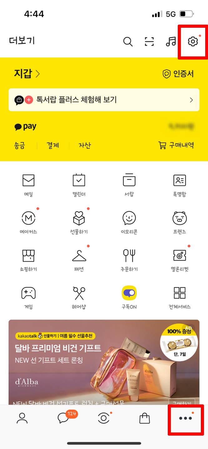 가장 먼저 해야 할 일은 맨 오른쪽에 위치한 점 3개의 더 보기 아이콘을 누른 후 맨 위의 톱니바퀴 아이콘을 눌러 설정 페이지로 이동하는 순서입니다.