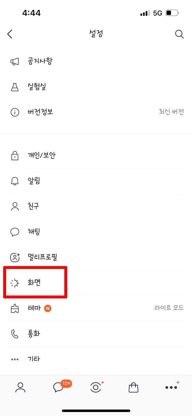 먼저 카카오톡 앱을 실해시킨 후 맨 아래에 나열되어 보이는 5개 정도의 아이콘이 보이시죠?