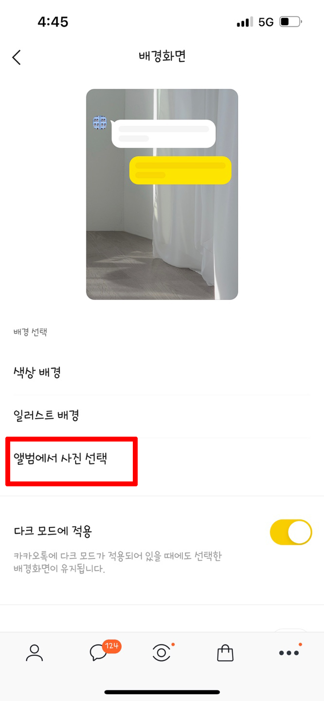 마지막은 앨범에서 사진 선택입니다.말 그대로 제 휴대기기 안에 저장되어 있는 사진을 이용하여 제 취향에 맞게 카카오톡 벽지를 바꿀 수 있는 방법입니다!
