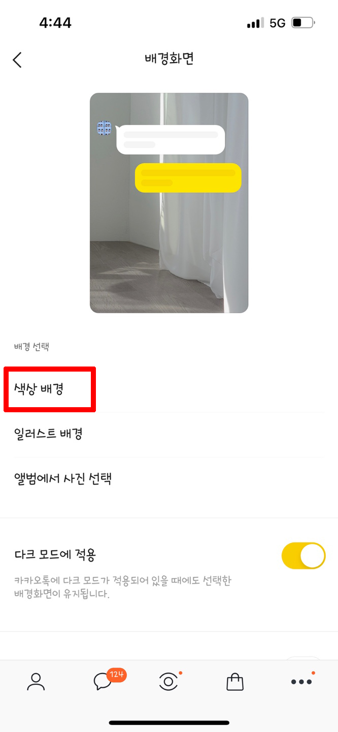 여기서 마음에 드는 색상을 하나 지정하면 바로 카카오톡 벽지를 바꾸는 게 성공적으로 끝나거든요~