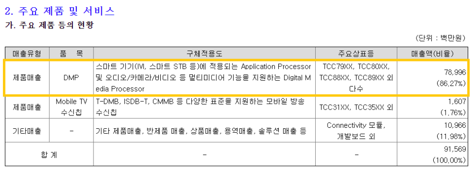 텔레칩스의 주요 매출을 보면 IVI로 불리는 차량용 인포테인먼트(오디오, 내비게이션 등) 비중이 가장 높습니다. 86%나 됩니다.