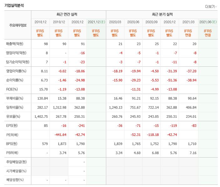 영업이익 2018년에는 8억의 영업이익을 기록하고 있으며 2019년 2020년도에는 적자를 내고 있는 안타까운 모습을 보이고 있습니다. 신종 코로나바이러스 감염증의 영향일까요, 최근 분기 실적이 연속적으로 적자를 보이고 있습니다. 대규모 영업이익 적자는 아니지만 회사 규모가 작기 때문에 1년간 영업이익만큼 적자가 발생하고 있습니다.부채비율 부채비율은 2018년도 130%에서 88%로 줄어들고 있어 다행입니다. 영업이익이 계속 줄어들고 있지만 오히려 부채비율이 줄어드는 모습을 보이고 있어 이례적이라고 생각합니다.