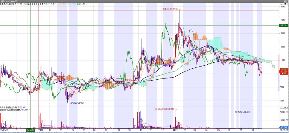 상장된 지 얼마 안 돼서 전기 차트예요. 처음으로 주가는 큰 폭으로 하락했어요. 아무래도 상장한 지 얼마 되지 않아 코로나 여파를 맞아 계속 하락했는데요. 자율주행주가 이슈가 된 20년 후반부터 거래량이 증가하면서 폭발적으로 상승해 신고가 18,450원을 기록하며 조정 중입니다.