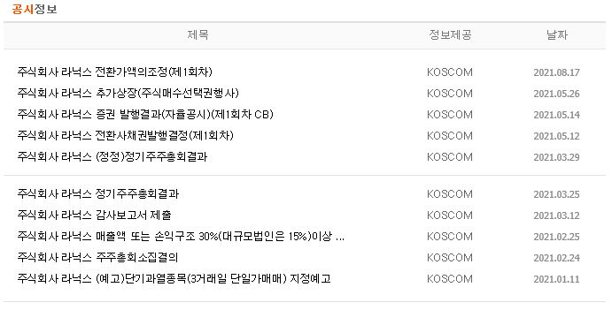 오늘 포스팅은 이것으로 마무리하고 다음에 더 알찬 포스팅으로 만나도록 하겠습니다.라닉스 본문 첨부문서 목차 반기보고서[대표이사 등의 확인] I.회사의 개요 1.회사의 개요 2.회사의 연혁 3.자본금 변동사항 4.주식의 총수 등 5.정관에 관한 사항 II.사업의 내용 1.사업의 개요 2.주요 제품 및 서비스 3.원자재 및 생산설비 4.매출 및 수주상황 5.위험관리 및 파생거래 6.주요계약 및 연구개발활동 7.기타 참고사항 1.요약재무정보 2.연결재무제표 3.연결재무제표 주석 4.재무제표 주석 6.배당에 관한 사항 7.증권의 … dart.fss.or.kr