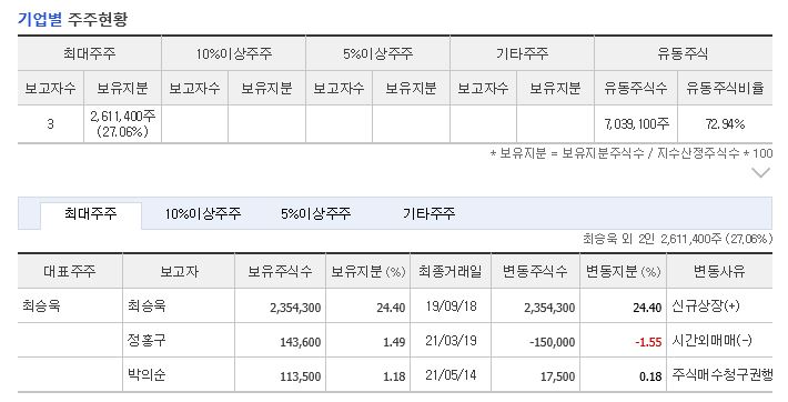 최대주주 보고자 수는 3명이며 보유 지분은 27.07%입니다. 유동주식은 72.94%로 유동주식이 많은 게 좀 아쉬운 부분입니다. 유동주식 비율이 많을수록 주가가 요동치는 상황이 많이 놓일 수 있습니다.