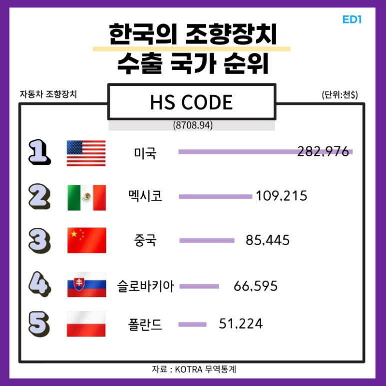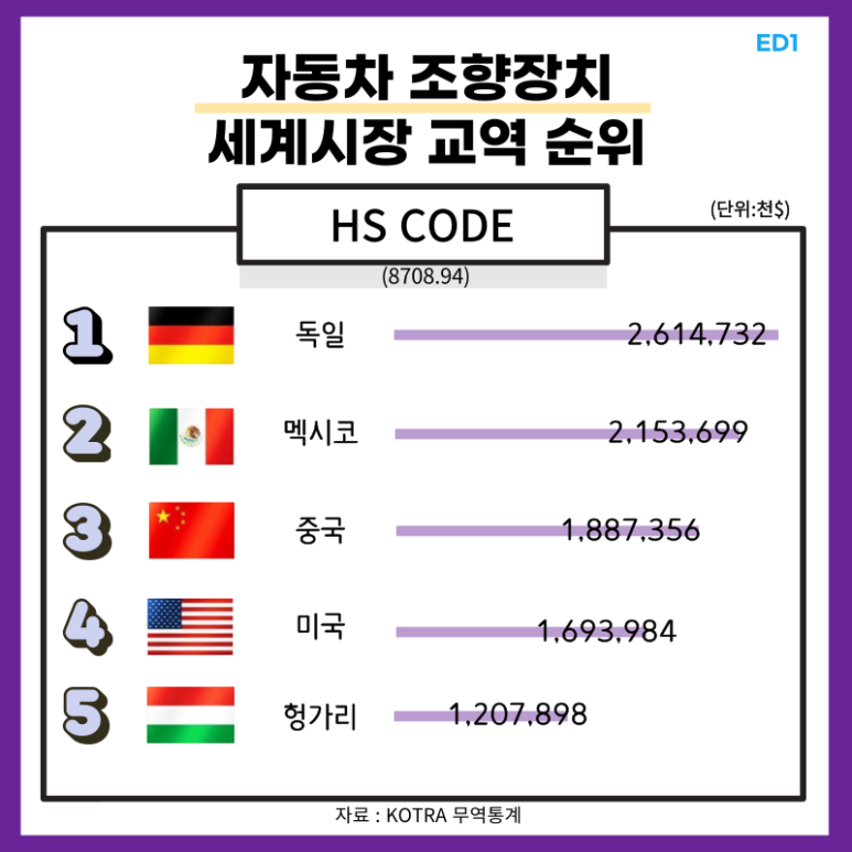 이런 자율주행차를 만들려면 필수 부품인 스티어링 장치가 필요합니다.미래 자동차 변환에도 스티어링 장치는 필수 부품이어서 시장 성장 가능성이 높습니다.오늘은 필수 부품인 자동차 스티어링 장치의 수입 교역 순위와 시장 동향에 대해 소개하고자 합니다.