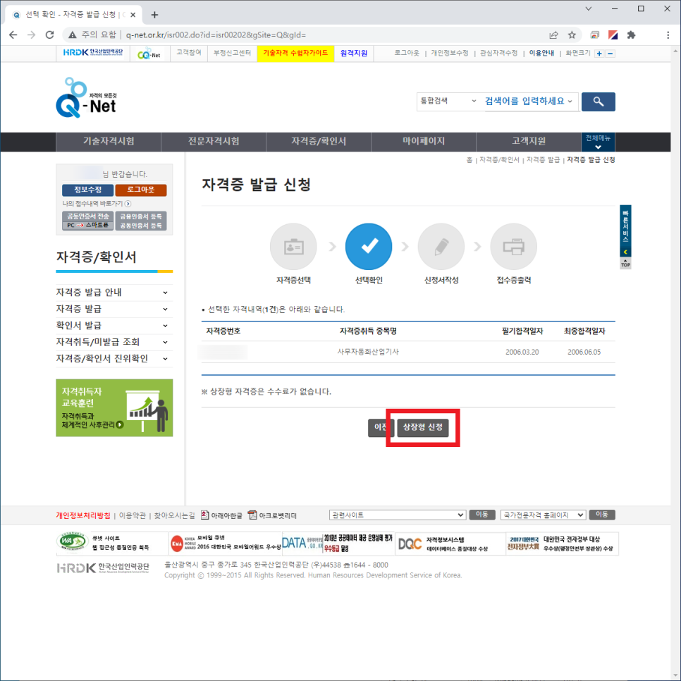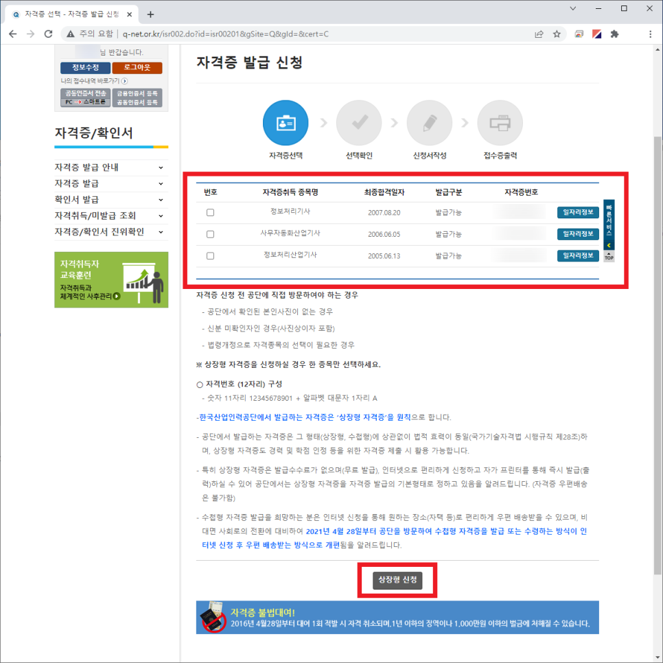 자격증 발급 신청 페이지가 열립니다.취득한 자격 리스트가 나타나는데 발급하고자 하는 자격을 선택한 후 하단에 있는 상장형 신청 버튼을 클릭합니다.