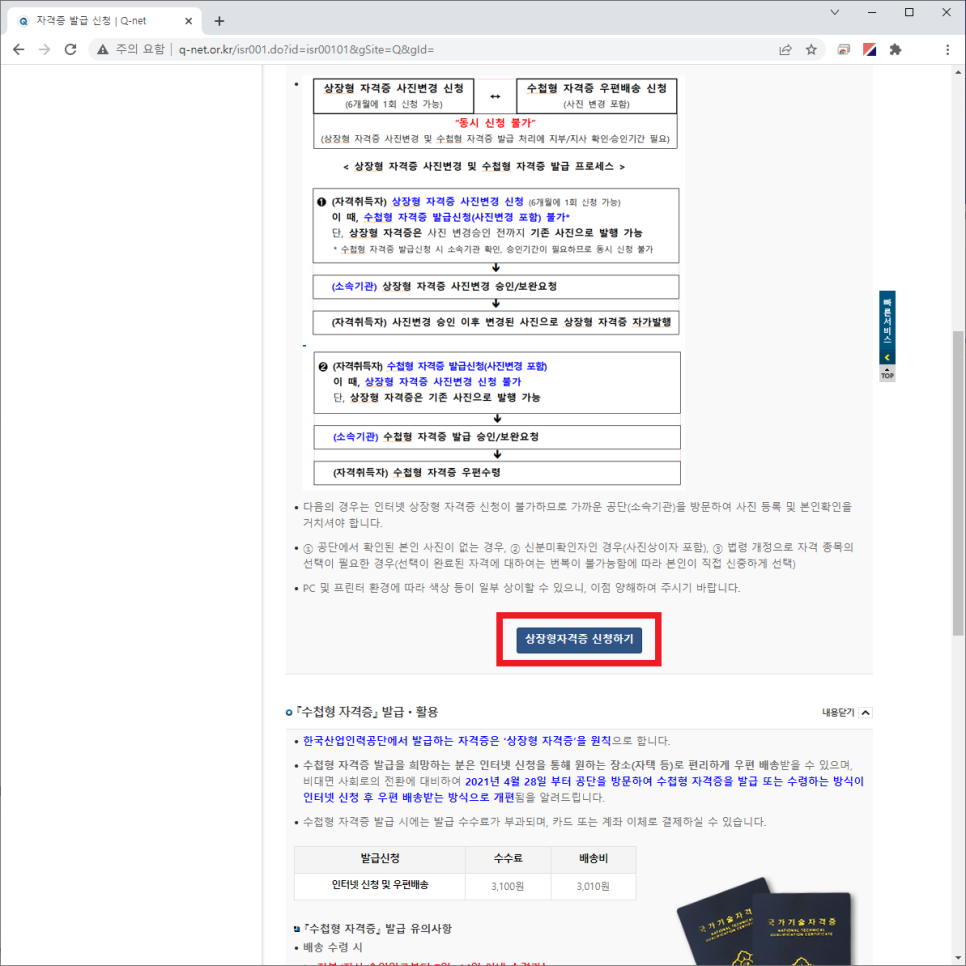 상장형 자격증은 무료로 발급받을 수 있으며 바로 출력하여 사용할 수 있습니다.수첩형 자격증은 아래와 같이 발급 수수료 및 배송비가 부과되며, 우편배송으로 7~14일 이내에 수령할 수 있다고 합니다.