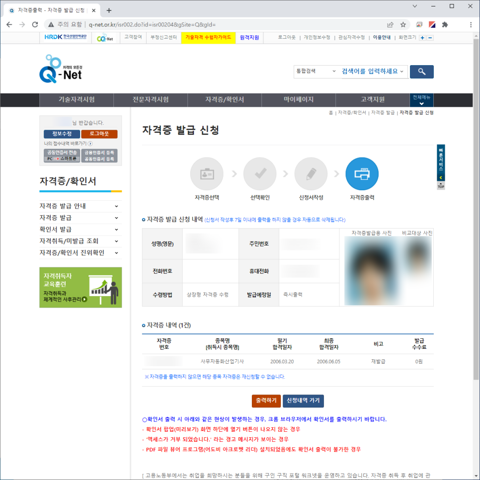 신청 내역을 확인하고 하단의 ‘출력’ 버튼을 눌러 출력하면 상장형 자격증 발급이 완료됩니다.