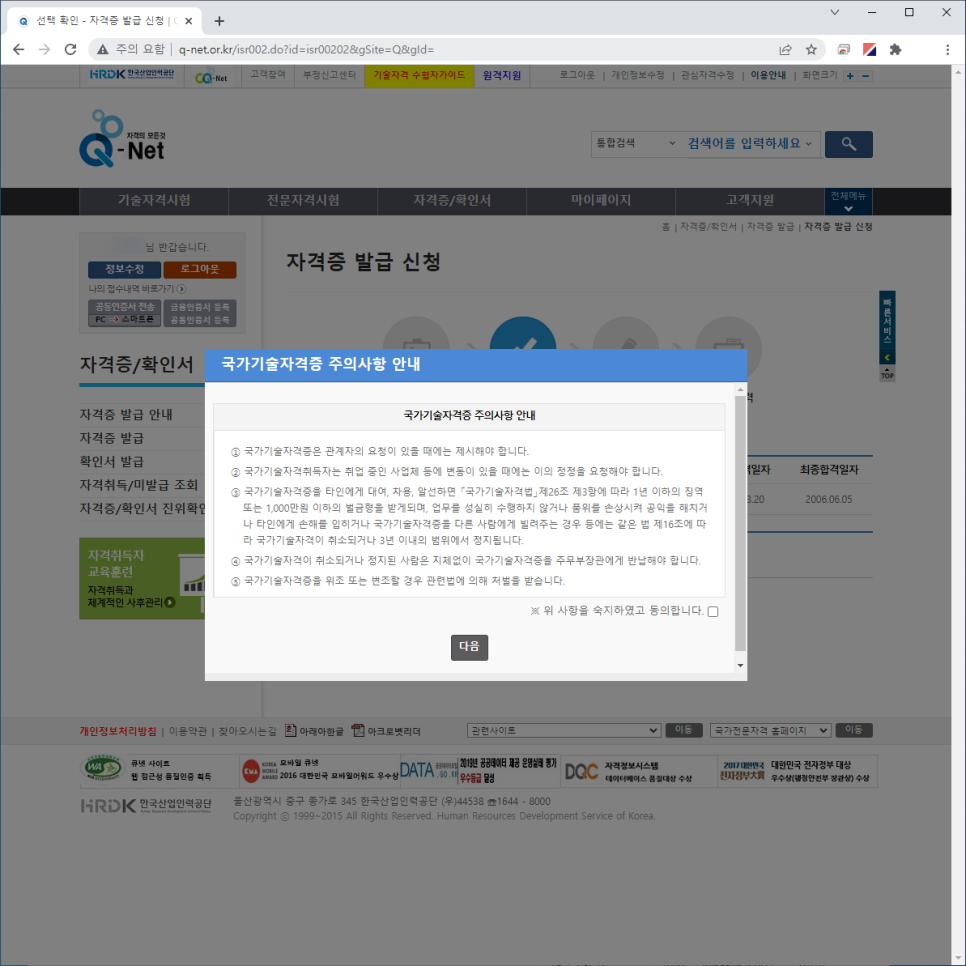 국가기술자격 주의사항 안내창이 열리는데 오른쪽 하단에 동의합니다를 체크한 후 다음을 클릭합니다.