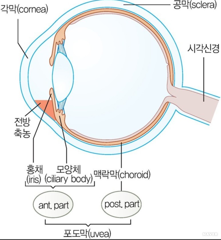 포도막이란 안구의 중간층에 있는 전방의 홍채, 중앙의 섬모체(형체), 뒤쪽 맥락막으로 이루어진 것입니다. 여기에 염증이 생긴 것을 포도막염이라고 합니다.