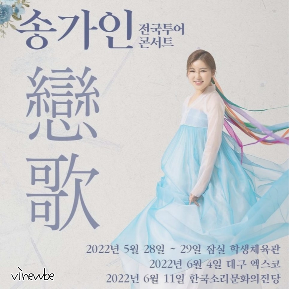 가장 먼저 서울 잠실학생체육관에서 시작하는 송가인 콘서트는 2022년 5월 28일 토요일과 29일 일요일 양일간 진행된다고 합니다.공연 시작 시간은 17시로 총 120분 동안 공연이 예정되어 있다고 하는데 공연 소개를 보면