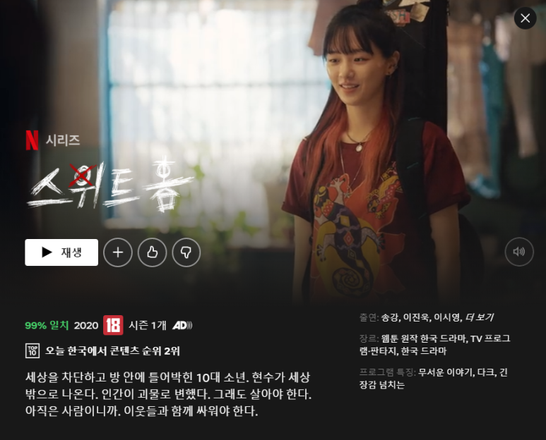 공개된 후 국내는 물론 해외에서도 뜨거운 반응을 불러일으킨 넷플릭스 오리지널 드라마로 김강비, 황영찬 작가의 동명 웹툰을 드라마로 옮긴 작품입니다.사고로 부모를 잃은 뒤 외톨이가 된 현수(송강)가 이사하는 낡은 아파트에서 겪는 충격적인 사건.
