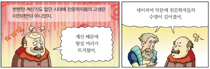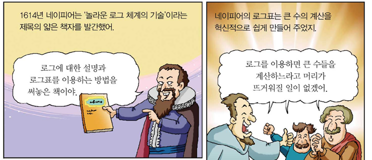 그리고 이런 관계를 이용해서 로그를 만들어 냈습니다. 지수를 거꾸로 바꿔서 보다 쉽게 계산할 수 있도록 한 것이 바로 로그였는데 <놀라운 로그체계의 기술>이라는 네이피어의 저서를 통해 세상에 알려지게 되었고 로그를 통해 복잡한 천문학 계산도 쉽게 할 수 있게 되었습니다.
