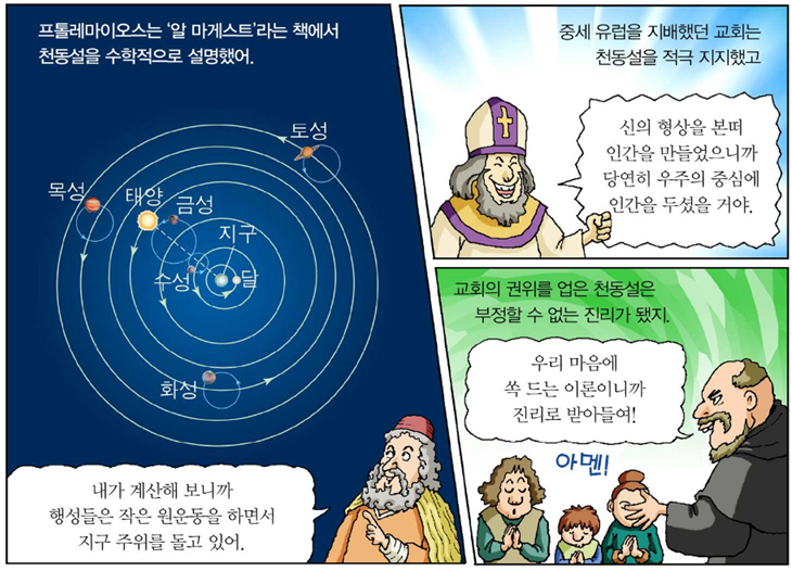 천동설은 2세기경 알렉산드리아의 프톨레마이오스가 주장한 것으로, 이후 기독교의 공인을 받아 더욱 확고한 지위를 확립하게 되었습니다. 또한 천동설을 부정하는 경우는 이단이라고 하며, 죽음을 당하는 경우도 있었습니다.