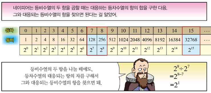 우리가 알고 있는 자연수처럼 앞의 수에 같은 수를 더해서 일정하게 커지는 수열을 등차수열이라고 합니다. 그리고 앞의 수에 같은 수를 곱해서 일정하게 커지는 것을 등비수열이라고 하는데 네이피어는 이들 사이의 규칙을 활용하여 지수 계산을 통해 큰 수도 쉽게 계산할 수 있는 것으로 나타났습니다.
