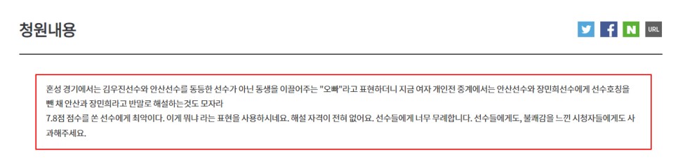 청원인은 “혼성경기에서는 김우진과 안산 선수를 동등한 선수가 아닌 ‘동생(안산)을 이끌어주는 형’이라고 표현했지만, 지금 여자 개인전 중계에서는 안산 선수와 장민희 선수에게 선수 호칭을 제외하고 안산 장민희 선수와 반말로 해설한다”고 말했다.
