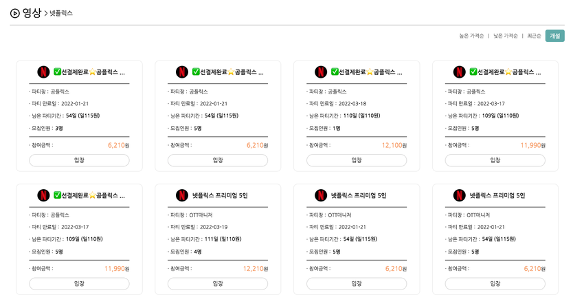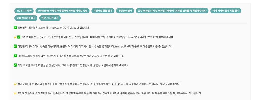 그런데 쉐어365는 처음부터 OTT 종류별로 인원을 모집해 원하는 것을 선택한 후 결제-ID 전달 구조로 매우 쉽게 사용할 수 있었다.