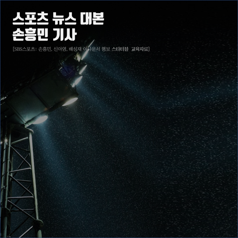 요즘 스포츠 스타하면 어떤 선수가 떠오르세요? 배구선수들의 문제로 시끄럽지만 좋은 영향을 줄 선수를 떠올려봅니다. 힌트는 환상적인 슛을 선보였고 골 득점 영상은 수없이 흐르고 있습니다. 2020년 푸스카스 상의 주인공입니다 바로 선소니!라고 불리는 남자. 토트넘 홋스퍼 FC 소속의 손흥민 선수입니다. 좀 오버했어요? 이미 제목에 있는데;; 사실 스타터블 대표 신수진 아나운서가 동기부여를 할때 자주 보는 동영상이 있는데 손흥민 선수의 골 영상이에요. 한마디로 찢었다 아니 아니 멋있어요 스포츠를 좋아해서 아나운서를 시작하는 학생도 있을 것이고, 전문적인 캐스터를 지원하는 분도 있을 것입니다. 이를 위해 전문적인 용어와 구단 역사와 선수들의 흐름을 파악하는 것도 중요합니다.현재 SBS 스포츠 뉴스는 김윤상 아나운서가 진행합니다. 2015년도 SBS에 입사하여 따뜻한 외모로 팬덤을 형성하고 있는 아나운서이기도 합니다. 우람한 체력과 우렁찬 목소리가 만나면 스포츠 뉴스의 생동감이 넘칩니다. 스포츠 뉴스를 진행할 때는 기본적으로 밝은 얼굴과 힘찬 발성으로 현장감 넘치는 사회자가 적합합니다.이점을잘숙지하시고SBS스포츠뉴스대본의손흥민관련기사를읽어보도록하겠습니다.해당본문은리포트형식의기사로앵커와기자로나누어진대본입니다. 스터디를 할 때 둘이서 역할을 바꿔서 읽어보는 것도 긍정적인 도움이 됩니다.
