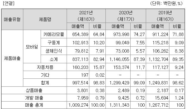 특히 사업구조가 모바일 카메라 모듈이 80%를 차지하고 있어 전방시장의 영향을 크게 받고 있습니다.(삼성전자 매출 비중 2021년 말 68%)