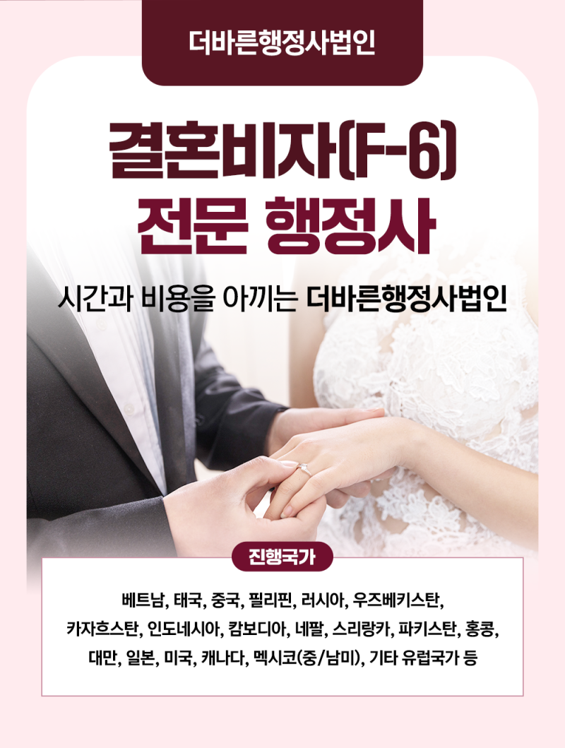 이렇게 결혼비자를 준비할 때는 본인의 상황에 따라 구비방법과 절차가 달라질 수 있습니다. 또 더 쉽게 진행할 수 있는 방법을 본인들이 모르는 경우도 있습니다. 물론 비용을 절약하기 위해서는 직접 준비하는 것이 좋을 것입니다.다만 준비에 어려움을 느끼거나 필수 요건을 제대로 입증하기 어렵다면 경험이 풍부한 전문가에게 의뢰해 일을 진행하는 것도 좋은 방법 중 하나일 것입니다. 결혼비자가 허가되지 않으면 6개월간 재신청이 어려우니 신중하게 생각해봐야 합니다. 다양한 사례를 통해 많은 경험과 노하우를 가진 행정사의 도움을 받는 것도 좋은 방법이라고 생각합니다.