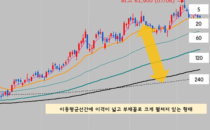 코스피 차트의 관점에서 2018년과 유사점인 저의 포스팅을 여러 번 본 분들의 경우 제가 1년 평균선(240일선)을 굉장히 중요하게 생각하고 있다는 것을 아시리라 생각합니다. 주식 파동은 240일선을 기준으로 고평가-저평가를 반복해 파동을 상하로 만들어갑니다. 위쪽으로 방향을 잡으면 저평가 구간이 짧아지거나 없어지고 아래쪽으로 방향을 잡으면 고평가 구간이 짧아지거나 사라지는 그림을 보여줍니다.장기이동평균선을 활용해 보자(1년 이동평균선, 추세전환 구간) 이번 포스팅은 장기이동평균선에 대한 저의 활용… blog.naver.com 240선을 기준으로 고평가 파동에 진입했을 때 나타나는 차트의 모습은 아래와 같습니다. 단기/장기이동평균선이 이격을 넓혀 크게 부채비율로 벌어지면서 주가는 240일선으로 크게 하락하는 모습입니다. 이평선이 정배열로 다양한 매매법을 적용하기에 적합하지만 전반적으로 과열 구간이라 한번 하락세를 시작하면 언제 제자리로 돌아갈지 약속하기 어려운 구간입니다.