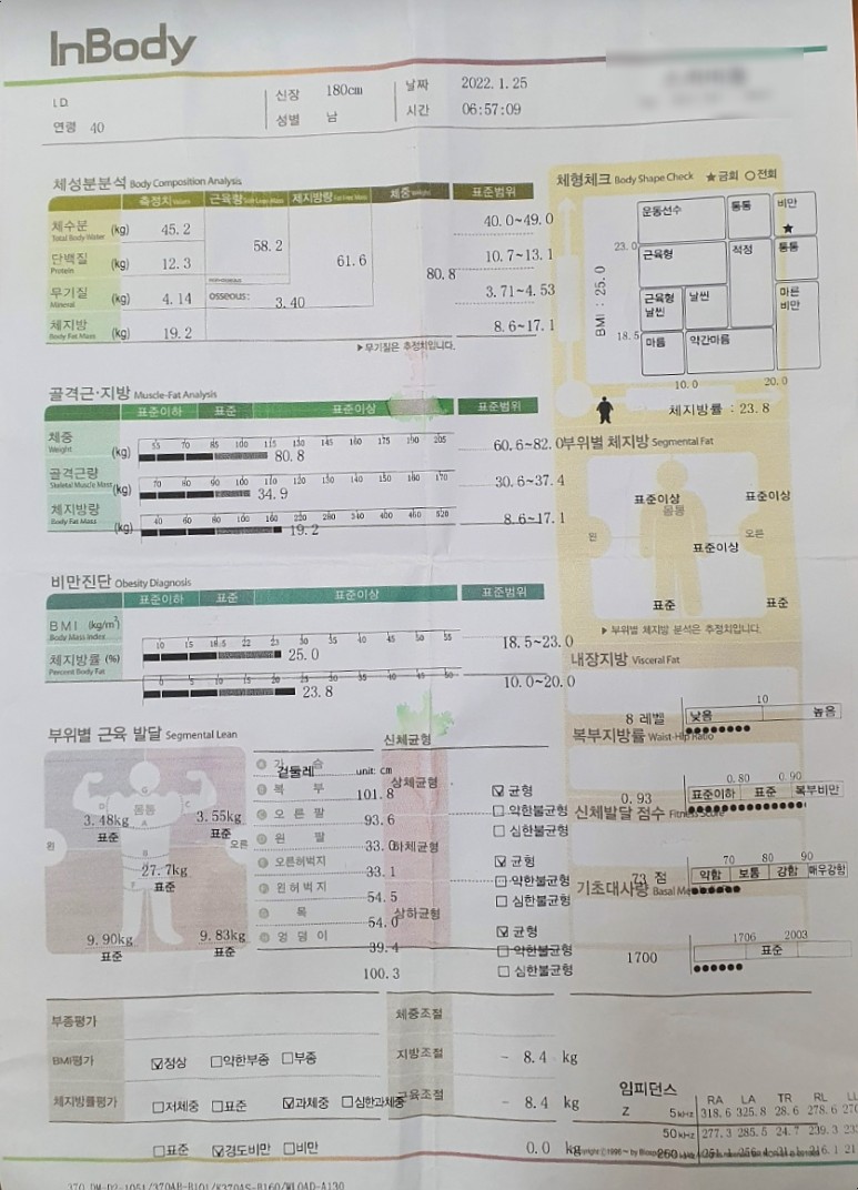 1월 25일 바디 측정 결과, 먼저 운동을 시작한 것은 1월 15일 정도부터이며, 당시 신장 180cm에 체중 84kg 정도였습니다. 그리고 운동을 10일째 정도 되는 날에 처음으로 인보디를 측정해 보았습니다.