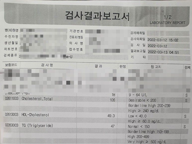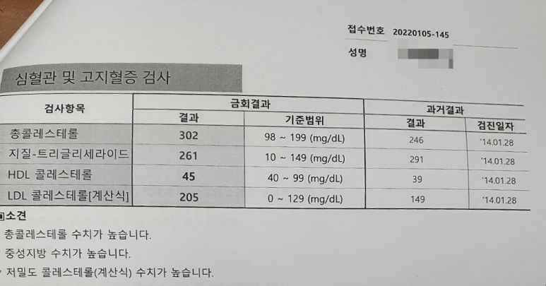 고지혈증 극복 후기 LDL콜레스테롤 205→47HDL콜레스테롤 45→49.3 중성지방 261→47 정확하게 극복하는 과정에 있습니다.실제 경험을 그대로 옮긴 것이니 참고하시기 바랍니다.올해 만 40세가 된 저는 2022년 1월 5일에 국가에서 실시하는 종합검진을 실시하였습니다. 작년 초에 어깨를 다쳐서 운동을 전혀 하지 않았기 때문에 근육은 떨어지고 지방만 늘어난 상태라 결과가 좋을 거라고 전혀 기대하지 않았습니다. 아무 생각 없이 전날 밤까지 먹고 싶은 걸 다 먹고 늦게 잔 저는 아침 7시에 일어나서 종합검진을 받으러 갑니다.