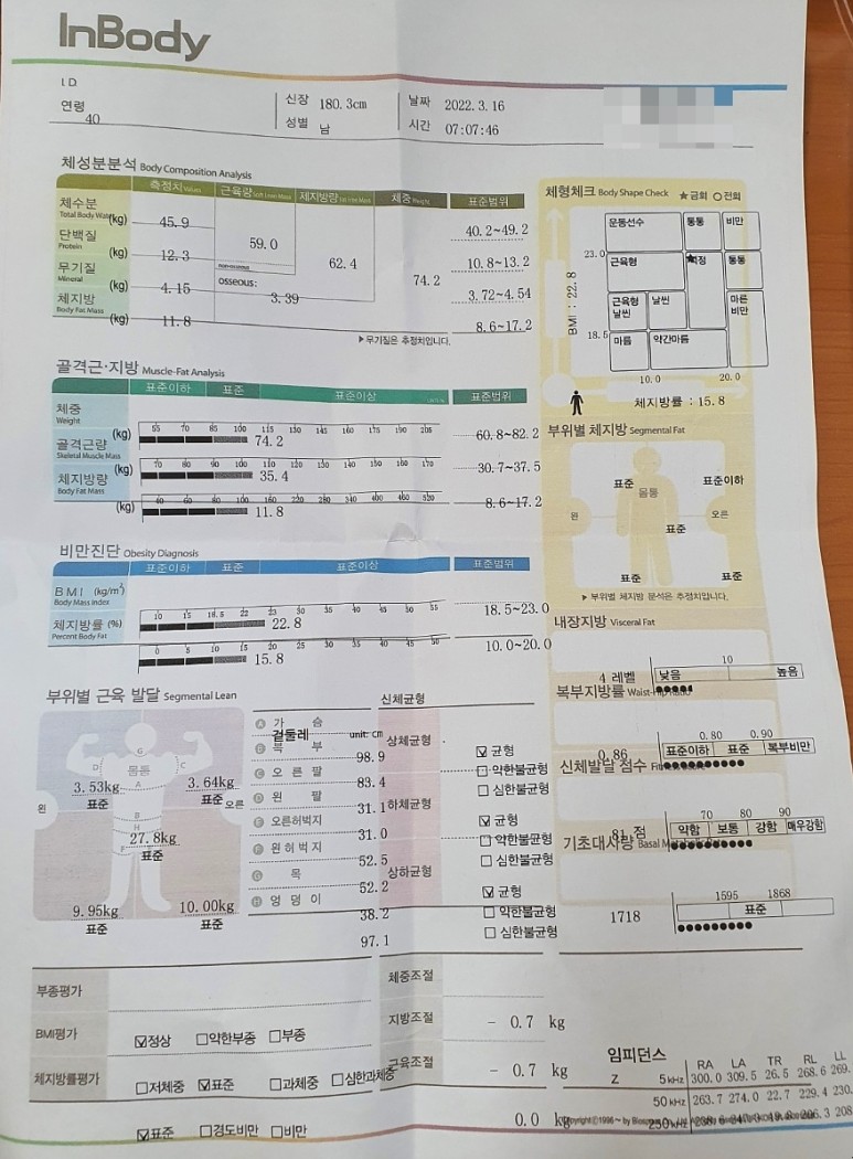 그리고 아래 사진은 오늘 아침(3월 16일) 측정한 인보디 결과입니다.