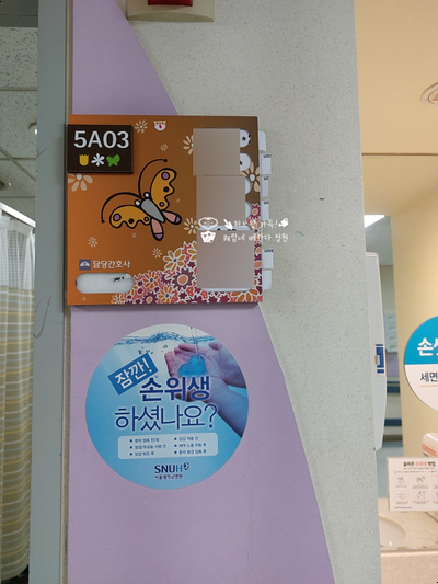 배정된 병실 안으로 이동! 배정된 자리를 보니 소아병동 입원실이라 병실 안에 침대가 많이 좁을 줄 알았는데 보호자도 같이 누워도 될 만큼 넓고 우선 좋았습니다~ (물론 집 침대만큼은 아니지만 병원 침대치고는..ㅋ)
