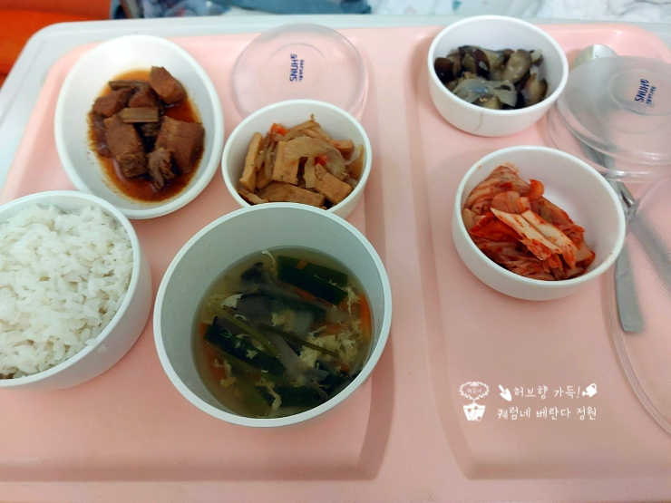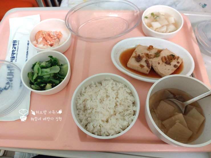 아기 돌보러 식당에 갈 시간이 없을 것 같아서 보호자 식사 신청해 놨어요 저녁 시간만 되면 이렇게 음식이 나오거든요 음… 병원 밥이라 기대는 안 했는데 국이랑 반찬 양이 생각보다 적네요그래서 그런지 먹고나서도 뭔가 허전해~~