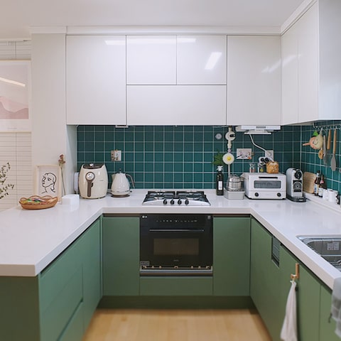 특히 주방 벽 타일은 모서리를 라운드로 재단하고 투명 실리콘으로 마감한 모습을 볼 수 있는데, 옆 부분에 타일을 가하지 않고 페인트 벽에 놓았다면 얼룩이 많이 좋아졌을 텐데 지금은 청소도 정말 편해졌습니다.