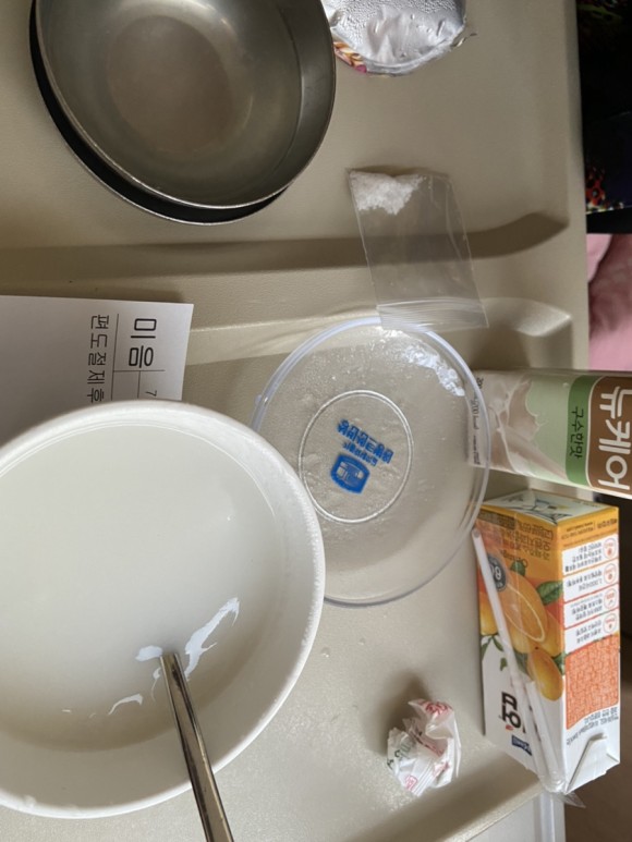 6시 30분에 저녁식사가 나왔고 역시 미움!! 하지만 동치미가 맛있었습니다. 주스나 뉴 케어에는 손도 대지 못했어요.