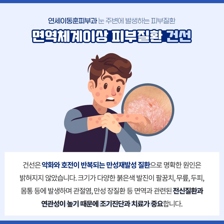 오늘은 피부 건선 질환이 면역과 관련이 있다는 것을 피부에 나타나는 증상 위주로 말씀드렸습니다.우리 몸에서 발생하는 여러 질환들은 코로나19처럼 외부 영향이 아닌 다음에는 대부분 내부 면역과 관련이 있는 경우가 많습니다.그러니까 평소에 면역을 안정시키는 생활 습관이 중요한 거죠.
