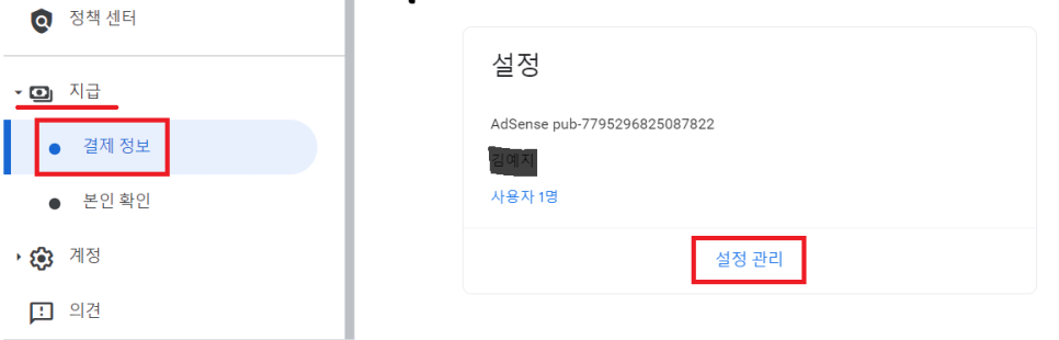 - 2. 왼쪽 카테고리에서 지급 – 결제 정보를 클릭하십시오.