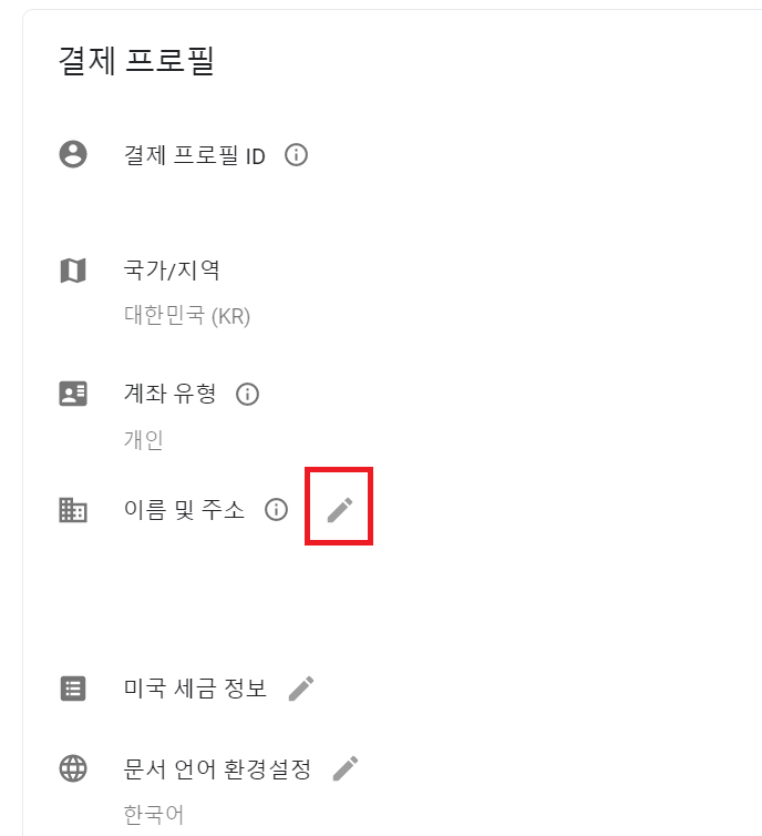 4. 결제 프로필로 화면이 바뀌고 여기서 이름과 주소 옆에 수정을 클릭하여 수정하면 주소 수정 완료!