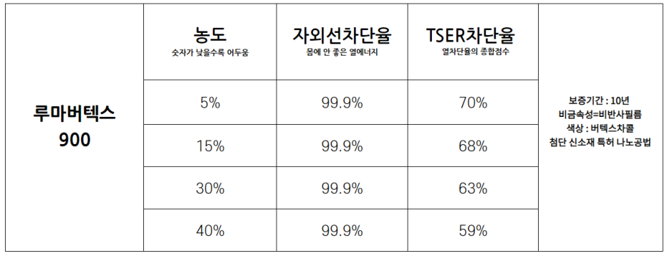A.S 기간이 7년으로 올랐네요.TSER=총 태양에너지 차단율도 500은 15% 농도 대비 55%인데 비해 10% 오른 65%를 보여주네요.