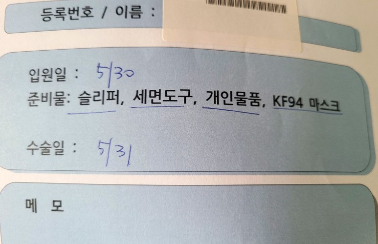 신종 코로나바이러스 감염증 때문인지 병원마다 입원 절차도 조금씩 다른 것 같았습니다.아예 보호자가 상주할 수 없는 병원도 있었는데.